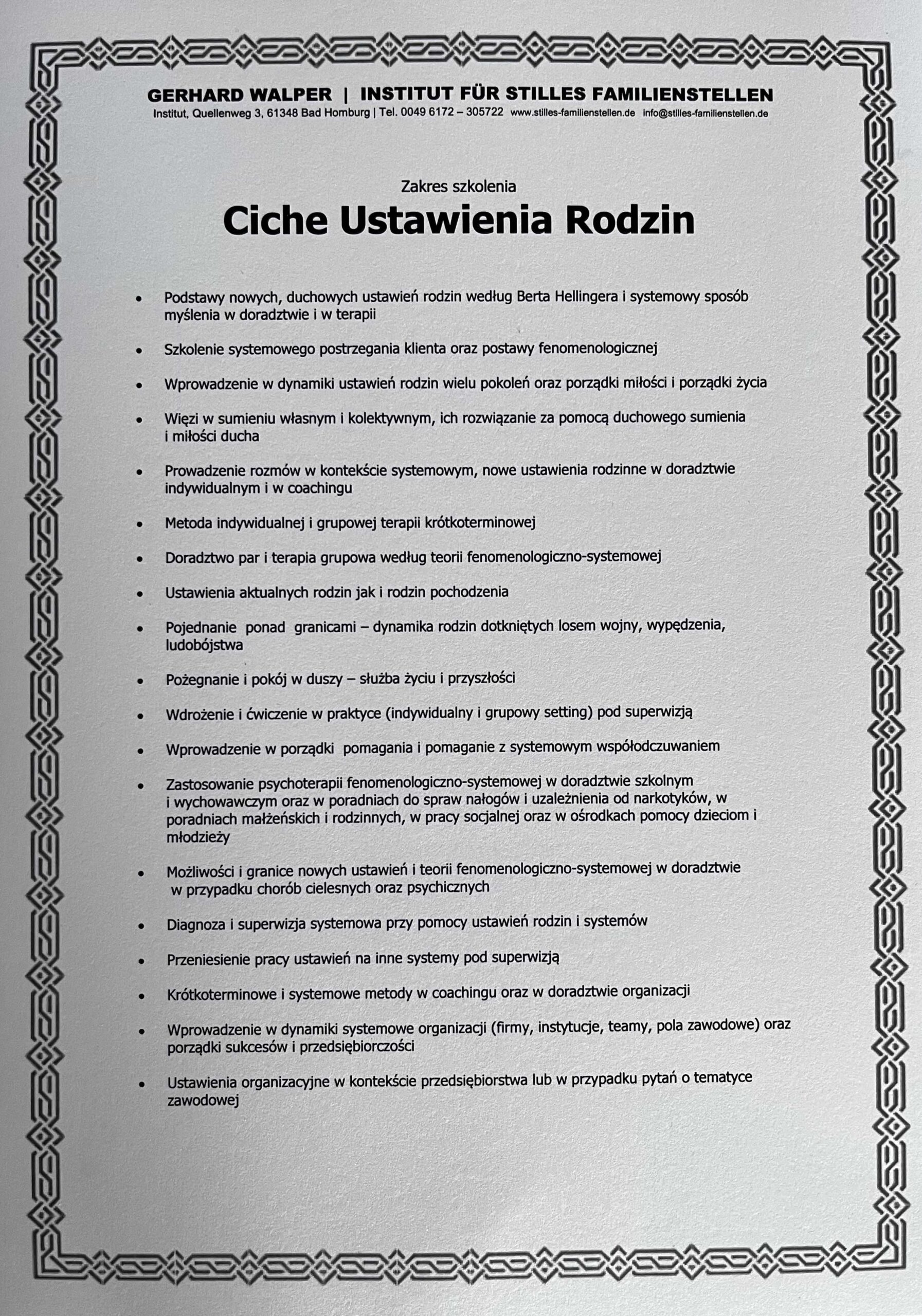 Poznałem też Ustawienia Systemowe Rodzin, które spopularyzował i rozwinął Bert Hellinger. W tym momencie jest to mój podstawowy kierunek pracy ze sobą i z drugim człowiekiem, nie zapominając jednak o pozostałych metodach, które pozwalają mi patrzeć szerzej na ludzi i ich Świat.